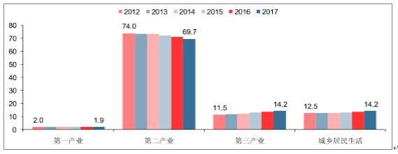2012-2017 年我國各用電領(lǐng)域用電量占比情況(單位:% )
