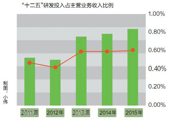 “十二五”期間科技投入合計(jì)341億元,年平均增長率約16%,到2015年占主營業(yè)務(wù)收入比例達(dá)到1.8%;研發(fā)投入合計(jì)118億元,年平均增長率約14%,到2015年占主營業(yè)務(wù)收入比例達(dá)到0.6%。實(shí)施領(lǐng)軍人才開發(fā)工程。圍繞提高自主創(chuàng)新能力、建設(shè)創(chuàng)新型企業(yè)的目標(biāo),以高層次創(chuàng)新型科技人才為重點(diǎn),培育1-2名院士后備人才,培養(yǎng)造就10名在電網(wǎng)關(guān)鍵技術(shù)領(lǐng)域掌握核心技術(shù)的復(fù)合型科技領(lǐng)軍人才,打造5個(gè)在國內(nèi)外具有較高影響力的科研團(tuán)隊(duì)。