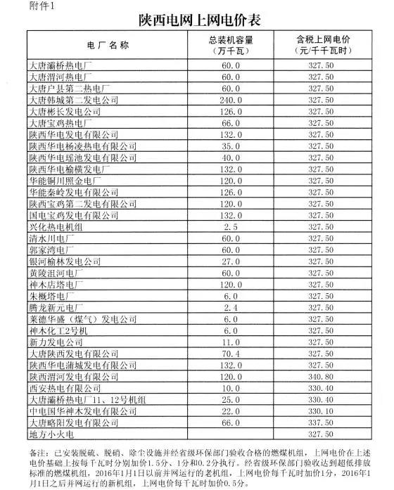 即“自2017年7月1日起,陜西電網(wǎng)統(tǒng)一調(diào)度范圍內(nèi),執(zhí)行燃煤機(jī)組(含熱電聯(lián)產(chǎn)機(jī)組)脫硫、脫硝、除塵標(biāo)桿上網(wǎng)電價(jià)及新投產(chǎn)且安裝運(yùn)行脫硫、脫硝、除塵設(shè)施的燃煤機(jī)組上網(wǎng)電價(jià)每千瓦時(shí)提高為0.3545元(含稅,下同),自備電廠上網(wǎng)電價(jià)每千瓦時(shí)同幅度提高1.99分。
