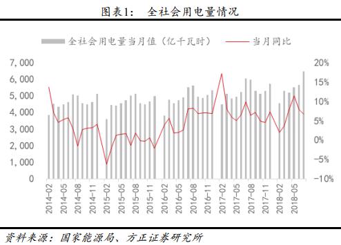 7 月用電量增速 6.8%,較上月增速環(huán)比降低 1.2 個百分點,已連續(xù) 2 個月出現(xiàn)環(huán)比下降,其中二產(chǎn)、三產(chǎn)和居民用電量增速分別環(huán)比變化-2、-2 和+5.2 個百分點。7 月用電增速環(huán)比下滑或因工業(yè)生產(chǎn)用電需求降低所致,2018 年 7 月份,規(guī)模以上工業(yè)增加值同比實際增長 6.0%,與 6 月份持平,為近一年最低水平,較去年 7 月 6.4%的增速下滑 0.4 個百分點。居民用電增速環(huán)比大增,主要因為 7 月全國平均氣溫較常年同期偏高 1℃,甘肅、湖北、吉林、遼寧、山東等地多發(fā)極端高溫天氣,帶動居民用電需求增加較多。