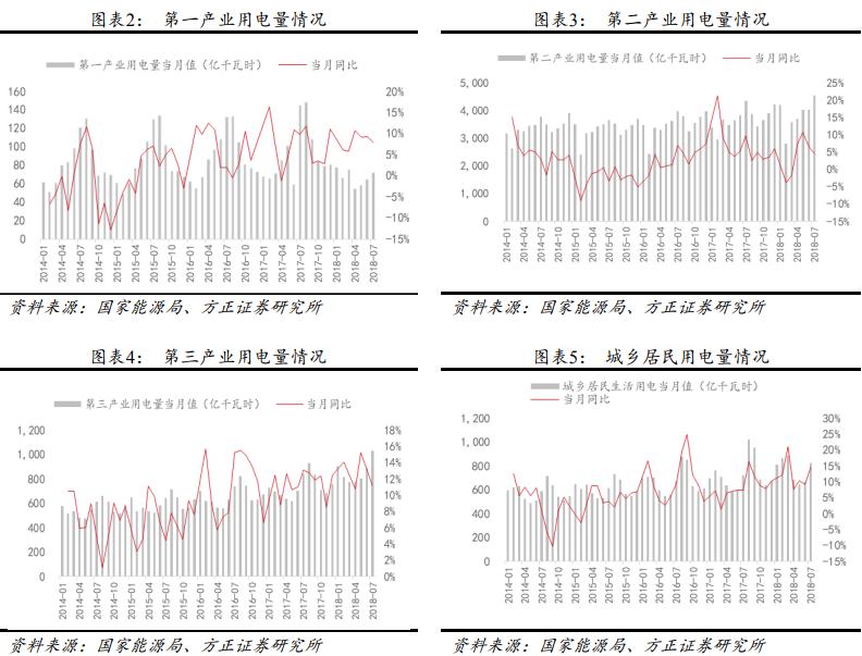 根據(jù)今年調(diào)整后的統(tǒng)計口徑計算得出,2018 年 7 月二產(chǎn)、三產(chǎn)和居民的用電量增量為 200.40、103.84 和 104.98 億千瓦時,增量絕對值同比去年 7 月變化為-48.28%、+6.74%和+105.59%;增量貢獻占比 48.35%、25.05%和 25.33%,居民用電量增幅較大,三產(chǎn)和居民用電占 7 月用電量增量的 50.38%,成為 7 月用電增長的主力。