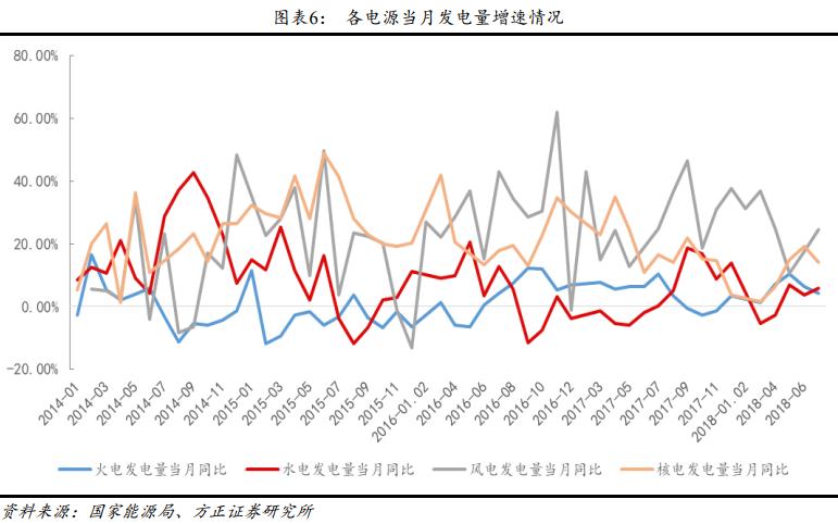 7 月份全國平均降水量 133.8 毫米,比去年同期多 18.9%,使得水電發(fā)電量同比增長較快,擠壓一部分火電發(fā)電空間,因此火電發(fā)電量增速環(huán)比回落 2 個百分點,同時因降雨較多使得光伏發(fā)電量增速較上月有明顯回落;核電因上月同期存在機組檢修,因此發(fā)電量增速達到 19.3%,本月增速有所回落;7 月南海及西北太平洋臺風活躍,共有 5 個臺風生成,3 個登陸,生成和登陸個數(shù)較常年(1981-2010 年)同期分別偏多 1.3 個和 1 個,因此 7 月風電發(fā)電量同比大增。