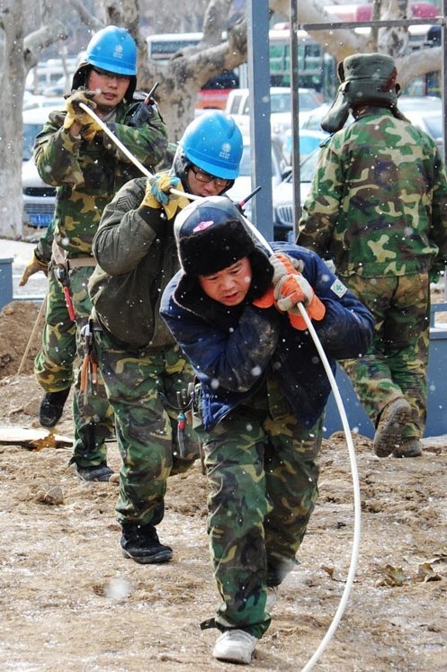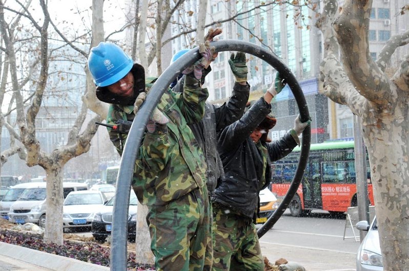 國家電網山東威海供電公司作業(yè)人員正在冒雪為市中心地下變電站35千伏寶泉站進行高壓電纜線路敷設。