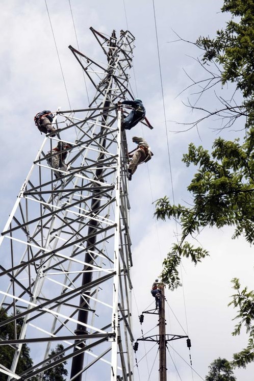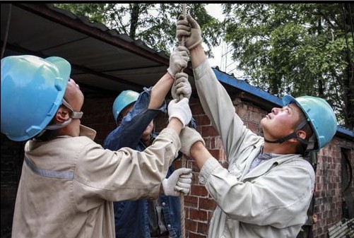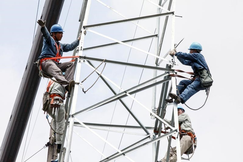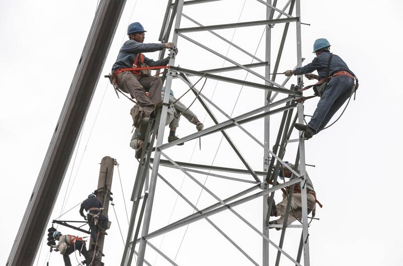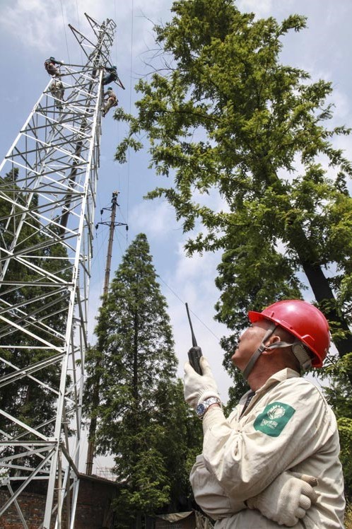 5月27日,江蘇泰州安泰輸變電工程有限公司工作人員正在35千伏口港線88號-90號改造現(xiàn)場組立鐵塔。