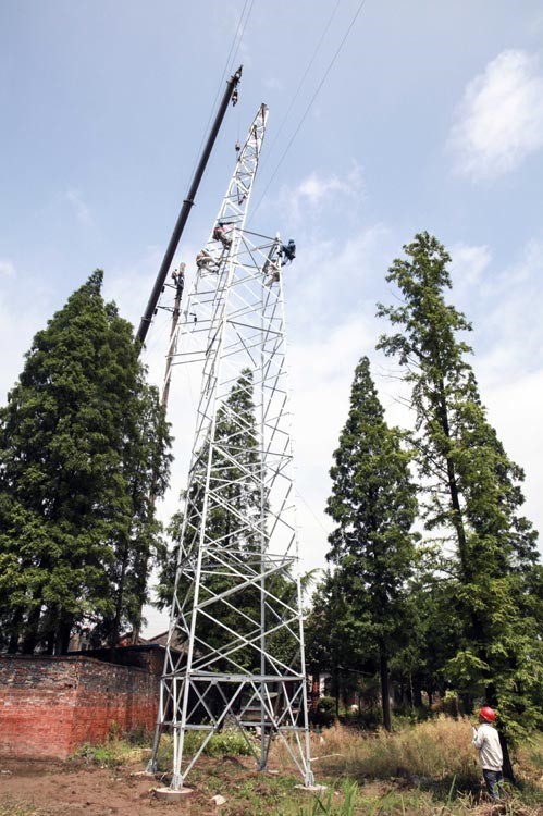 5月27日,江蘇泰州安泰輸變電工程有限公司工作人員正在35千伏口港線88號-90號改造現(xiàn)場組立鐵塔。 35千伏口港線工程肩負著泰州市高港區(qū)務(wù)港局和長江口岸閘口的供電任務(wù)。此線路已投運近20年,由于運行年限