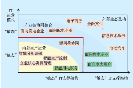 根據(jù)國家電網(wǎng)公司業(yè)務形態(tài)分布,營銷服務主要包括內(nèi)部生產(chǎn)運營中的智能用電服務業(yè)務及產(chǎn)業(yè)鏈協(xié)同整合中的面向電力用戶業(yè)務[12],因此,對于營銷服務的信息通信支撐應包括“穩(wěn)態(tài)”IT架構、“敏態(tài)”IT架構,配套“穩(wěn)態(tài)”IT運營模式及“敏態(tài)”IT運營模式(見