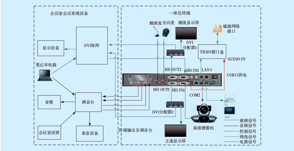分析一體化終端的接線和信號(hào)原理[13-15],通過(guò)技術(shù)改造實(shí)現(xiàn)一體化終端音視頻信號(hào)外接至?xí)h室外圍設(shè)備,充分利用會(huì)議室現(xiàn)有的外圍設(shè)備資源,設(shè)計(jì)了一體化終端音視頻信號(hào)外引組網(wǎng)方案。一體化終端外接系統(tǒng)接線圖如