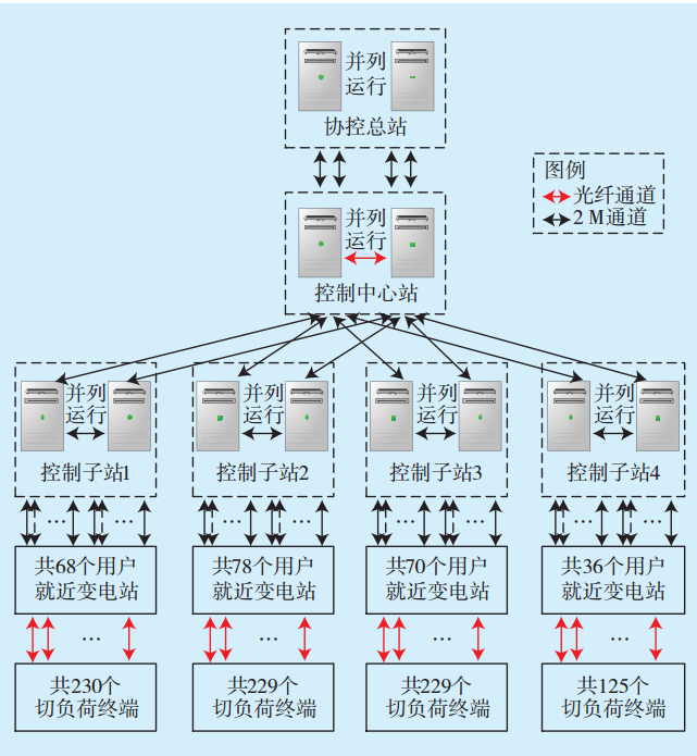 系統(tǒng)保護(hù)由區(qū)域協(xié)控總站、控制主站、控制子站和終端構(gòu)成。區(qū)域協(xié)控總站接收控制主站上傳的各直流故障信息、可切負(fù)荷信息等,給出決策或控制策略,并向各控制主站下達(dá)控制指令,進(jìn)行負(fù)荷分配;控制主站負(fù)責(zé)收集各子站發(fā)送來的信息,同時也接收協(xié)控總站的控制指令,根據(jù)策略,向各子站下達(dá)控制指令;控制子站負(fù)責(zé)收集所轄終端的測量信息,匯總后上送至控制主站,并執(zhí)行控制主站發(fā)來的控制指令,將指令下達(dá)到具體的終端,子站主要起上傳下達(dá)的作用;終端負(fù)責(zé)將一、二次設(shè)備的測量信息上傳給控制子站,并接收控制子站的控制指令,快速切除故障或可中斷負(fù)荷[5]。