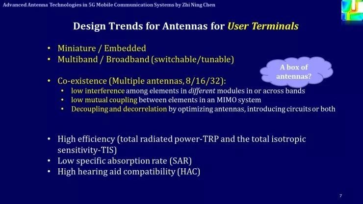 對(duì)于移動(dòng)終端而言,對(duì)天線的要求也是小型化、多頻段、寬頻段、可調(diào)諧。雖然這些特性現(xiàn)在也有,但5G的要求會(huì)更加苛刻。