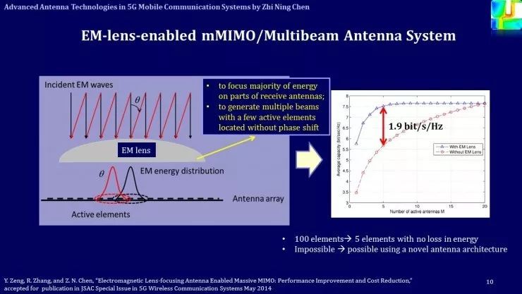 如果用多個(gè)單元在焦平面上輻射,就可以產(chǎn)生多個(gè)載波束的輻射,也就是所謂的波束成形;如果在這些波束之間進(jìn)行切換,就出現(xiàn)波束掃描的現(xiàn)象;如果這些天線同時(shí)用,就可以實(shí)現(xiàn)Massive MIMO。這個(gè)陣列可以很大,但在每個(gè)波束上只要用很少的陣列就可以實(shí)現(xiàn)高增益的輻射。