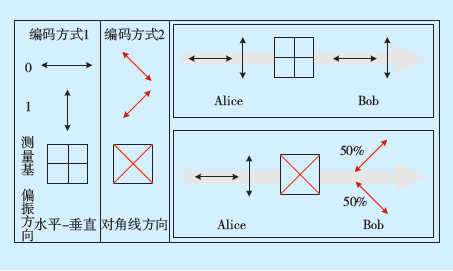 量子密鑰分發(fā)(Quantum Key Distribution,QKD)實施的安全性依賴于量子密鑰分發(fā)協(xié)議。在各類協(xié)議中最為基礎也最為接近實用化的協(xié)議是1984年由Charles Bennett和Gilles Brassard提出的BB84協(xié)議[6]。經(jīng)典比特使用“0”和“1”來描述,而量子密鑰采用量子比特替代經(jīng)典比特。根據(jù)量子態(tài)疊加原理,量子比特既可以是“0”和“1”,也可以是“0”與“1”。基于偏振式的QKD設備采用單光子的偏振態(tài)描述量子比特,主要的編碼方式有水平/垂直和45°/-45°2種。假設光子偏振方向為水平或-45°的狀態(tài)定義為“0”,那么垂直或45°的描述為“1”,且對應有互為共軛的測量基。發(fā)送方將偏振態(tài)發(fā)送給接收方,接收方隨機選擇2個共軛基中的一種通過光子偏振檢測器對量子的偏振反響進行測量。若測量基與發(fā)送基一致,則可保證測定偏振方向的正確性;若測量基與發(fā)送基不一致,則只有50%的概率可以判斷出正確的偏振方向,也就無法精確的測量出完整的信息。