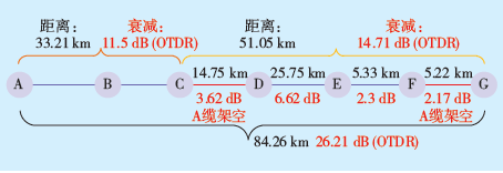 本次示范應用保障工作為量子信道開通了A點至G點的運行方式,量子線路由2條單模纖芯構(gòu)成,全長84.26 km,經(jīng)過B點、C點、D點、E點和F點,其中各節(jié)點間線路距離和光纖衰減情況詳見