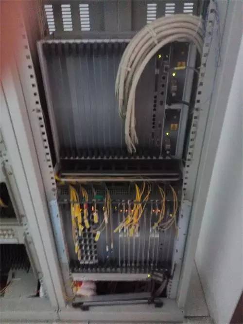 常見的光傳輸設(shè)備長這樣,上層的一大捆線就是2M線,這是往DDF去的,下一層好多黃色的纖就是尾纖,連接到ODF端子上。
