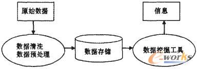 與傳統(tǒng)的統(tǒng)計(jì)分析相比。數(shù)據(jù)挖掘的確不用專(zhuān)門(mén)進(jìn)行實(shí)驗(yàn)設(shè)計(jì)和調(diào)查設(shè)計(jì)。不用為確定的目的準(zhǔn)備大量的數(shù)據(jù),因?yàn)樵谶M(jìn)行數(shù)據(jù)挖掘之前已有數(shù)據(jù)庫(kù),其目的也是不確定的。作為一種先進(jìn)的數(shù)據(jù)信息處理技術(shù),數(shù)據(jù)挖掘與傳統(tǒng)的數(shù)據(jù)分析的本質(zhì)區(qū)別在于它是數(shù)據(jù)關(guān)系的一個(gè)探索過(guò)程.而且多數(shù)情況下是在沒(méi)有任何假設(shè)和前提的條件下完成的。就現(xiàn)實(shí)來(lái)看。經(jīng)過(guò)幾年的信息化建設(shè),許多大中型企業(yè)已經(jīng)建立了比較完善的客戶(hù)關(guān)系管理(CRM)、ERP、OA等基礎(chǔ)信息化系統(tǒng),這種大集中系統(tǒng)已為數(shù)據(jù)挖掘準(zhǔn)備了較為成熟的條件。但直接從數(shù)據(jù)庫(kù)中截取的數(shù)據(jù)往往是冗余的、缺失的、有噪聲的,從而直接影響數(shù)據(jù)挖掘的效果。輸入數(shù)據(jù)庫(kù)中的異常數(shù)據(jù)、不相關(guān)的字段或互相沖突的字段、數(shù)據(jù)的編碼方式等,都會(huì)對(duì)數(shù)據(jù)挖掘輸出結(jié)果的質(zhì)量產(chǎn)生影響。數(shù)據(jù)挖掘最后成功與失敗,是否有經(jīng)濟(jì)效益。數(shù)據(jù)準(zhǔn)備起到了至關(guān)重要的作用。從原始數(shù)據(jù)轉(zhuǎn)化為挖掘信息的流程如圖1所示。