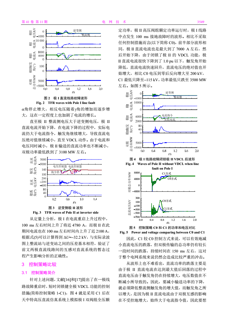 摘要:針對(duì)特高壓直流(ultra-high voltage direct current,UHVDC)運(yùn)行過(guò)程中一極直流線路故障重啟時(shí)對(duì)另一健全極運(yùn)行產(chǎn)生影響的問(wèn)題,考慮雙極直流線路間的互感,對(duì)暫態(tài)過(guò)程中雙極電氣量特征進(jìn)行深入研究。根據(jù)暫態(tài)過(guò)程中的電壓計(jì)算公式,對(duì)雙極之間的影響進(jìn)行了數(shù)值計(jì)算和物理解釋并對(duì)影響功率跌落的因素進(jìn)行分析,在已有健全極短時(shí)閉鎖低壓限流功能(voltage dependent current limit,VDCL)的控制措施基礎(chǔ)上提出了多項(xiàng)控制策略。以天中直流為研究對(duì)象,通過(guò)實(shí)時(shí)數(shù)字仿真(real-time digital simulator,RTDS)系統(tǒng)建立與實(shí)際一次系統(tǒng)和實(shí)際控制保護(hù)程序完全一致的仿真模型,對(duì)改進(jìn)策略進(jìn)行優(yōu)化比較研究,驗(yàn)證了在故障極重啟期間健全極整流側(cè)采用定電壓控制以及改變健全極的電流控制器參數(shù)兩項(xiàng)控制措施的有效性,最后提出了工程應(yīng)用建議。