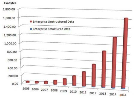 根據(jù)國(guó)際數(shù)據(jù)公司(IDC)的測(cè)算,2011 年數(shù)字世界將產(chǎn)生1800EB 的數(shù)據(jù),2012 年會(huì)增長(zhǎng)40%,達(dá)到2500EB。截止2020 年,會(huì)達(dá)到35000EB,似乎沒有足夠的磁盤空間存儲(chǔ)。就傳統(tǒng)IT 企業(yè)來(lái)看,其結(jié)構(gòu)化和非結(jié)構(gòu)化的數(shù)據(jù)增長(zhǎng)也是驚人的。2005 年企業(yè)存儲(chǔ)的結(jié)構(gòu)化數(shù)據(jù)為4EB,到2015 年將增至29EB,年復(fù)合增長(zhǎng)率逾20%。非結(jié)構(gòu)化數(shù)據(jù)發(fā)展更猛。2005 年為22EB,2015 年將增至1600EB,年復(fù)合增長(zhǎng)率約60%,遠(yuǎn)遠(yuǎn)快于摩爾定律。