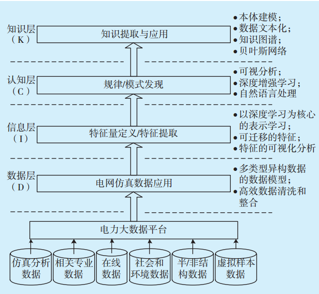 4)知識(shí)層。相較于電網(wǎng)仿真數(shù)據(jù)的分析和認(rèn)知,電力系統(tǒng)知識(shí)的提取和應(yīng)用目前尚處于起步階段。已有的研究主要涉及基于電網(wǎng)仿真分析數(shù)據(jù)的系統(tǒng)運(yùn)行規(guī)則提取、知識(shí)建模、知識(shí)庫(kù)構(gòu)建,以及基于語(yǔ)義模型的數(shù)據(jù)挖掘等方向[5,18]。