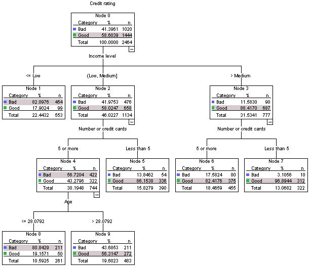 樹形圖是樹模型的圖形表示。該樹形圖顯示,使用 CHAID 方法時,收入級別是信用評級的最佳預測變量。