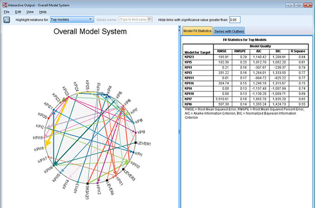 此圖顯示了與時間因果關系模型系統(tǒng)中的前 10 個模型(最匹配的模型)關聯(lián)的因果關系。監(jiān)控關鍵績效指標并跟蹤各種可控指標(稱為杠桿)數(shù)據(jù)的企業(yè)希望確定杠桿與 KPI 之間的因果關系,以便了解哪些杠桿影響哪些 KPI。該公司還希望了解在各 KPI 之間是否存在因果關系。
