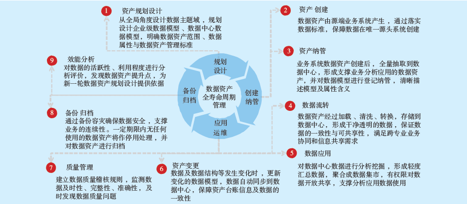 數(shù)據(jù)管理體系(Data Management Association,DAMA)是目前數(shù)據(jù)管理領域較為全面的國際理論體系,定義了數(shù)據(jù)治理、元數(shù)據(jù)管理、數(shù)據(jù)質(zhì)量、數(shù)據(jù)架構、數(shù)據(jù)開發(fā)、數(shù)據(jù)操作、數(shù)據(jù)安全、參考數(shù)據(jù)與主數(shù)據(jù)、數(shù)據(jù)倉庫和商務智能、文檔和內(nèi)容管理等10個主要的數(shù)據(jù)管理職能[7]。江蘇電力在充分研究DAMA的基礎上,參照企業(yè)資產(chǎn)管理目標和全壽命周期管理的共性方法,結合電網(wǎng)企業(yè)數(shù)據(jù)的個性特點,提出了數(shù)據(jù)資產(chǎn)“全壽命周期”的概念,將數(shù)據(jù)資產(chǎn)劃分為規(guī)劃設計、創(chuàng)建納管、應用運維、備份歸檔4個主要壽命階段、9個主要環(huán)節(jié)[8]。數(shù)據(jù)資產(chǎn)全壽命周期管理如