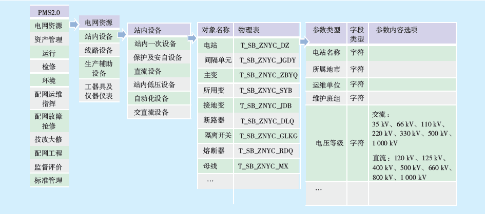PMS 2.0系統(tǒng)由電網(wǎng)資源等11個一級目錄組成。其中,“電網(wǎng)資源”包括站內(nèi)設備等4類二級域;“站內(nèi)設備”包含交直流設備等6個類別、電站等141個對象清單(見