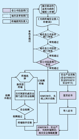 2)完成移動終端流程設(shè)計。公司各業(yè)務(wù)部門落實本專業(yè)移動終端安全防護(hù)要求,制定了各專業(yè)《移動終端應(yīng)用管理辦法》,建立終端申請、下發(fā)、報廢等流程機(jī)制,完善終端故障、丟失時的應(yīng)急處置機(jī)制。