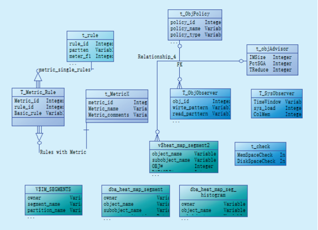 決策引擎的決策過程基于數(shù)據(jù)庫熱圖的幾個基礎(chǔ)視圖,如:v$heat_map_segment,以及本身策略庫的基礎(chǔ)表T_RULE和記錄決策引擎制定出的數(shù)據(jù)生命周期管理的方案T_OBJPOLICY,還有引擎運算使用的數(shù)據(jù)庫和操作系統(tǒng)各種狀態(tài)指標的采集表。
