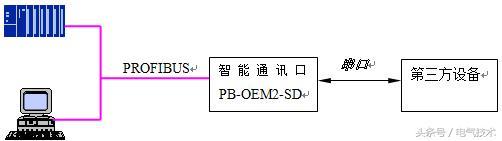 因此,本項(xiàng)目中提出了采用智能通訊口(PB-OEM2-SD總線橋)的解決方案。智能通訊口是一種嵌入式Profibus總線橋技術(shù),以O(shè)EM方式提供Profibus-DP的從站通信接口。用戶不需要了解Profibus開發(fā)技術(shù),不需要購買Profibus開發(fā)系統(tǒng),每臺(tái)需要聯(lián)網(wǎng)通訊的第三方設(shè)備只需各采用一個(gè)智能通訊口與PLC的Profibus-DP接口連接,就可將不具備Profibus通訊能力的現(xiàn)場(chǎng)設(shè)備接入Profibus現(xiàn)場(chǎng)總線系統(tǒng),其硬件連接圖如圖2。