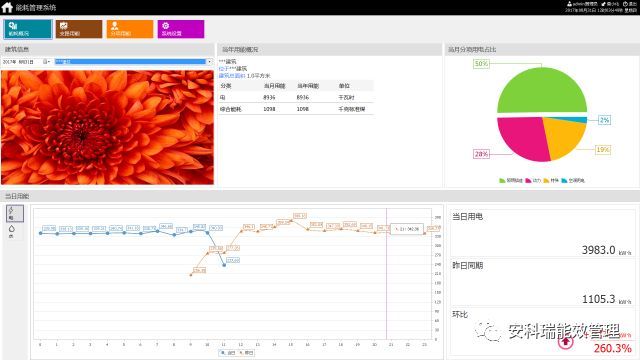 將電耗進(jìn)行逐時(shí)、逐日、逐月、逐年統(tǒng)計(jì)。統(tǒng)計(jì)數(shù)據(jù)采用餅圖、柱狀圖、線圖、區(qū)域圖等各種圖形展示方式,直觀反映各項(xiàng)統(tǒng)計(jì)數(shù)據(jù)的數(shù)值、趨勢和分布情況。
