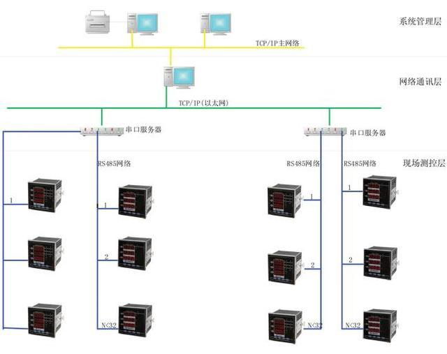 系統(tǒng)支持運(yùn)行TCP/IP網(wǎng)絡(luò)協(xié)議的局域網(wǎng)拓?fù)浣Y(jié)構(gòu),可把現(xiàn)場分成多個站點(diǎn),每個站點(diǎn)配置相應(yīng)的串口服務(wù)器,主站配置歷史數(shù)據(jù)庫服務(wù)器、報警服務(wù)器等,形成真正的分布式系統(tǒng)。既提高的整個系統(tǒng)的容量和可靠性,又增強(qiáng)了系統(tǒng)數(shù)據(jù)采集的效率。
