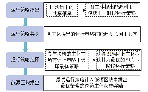 基于區(qū)塊鏈中的PoW(Proof of work)共識(shí)機(jī)制,能源互聯(lián)網(wǎng)中的各主體可根據(jù)區(qū)塊鏈中共享的用能數(shù)據(jù)、設(shè)備參數(shù)、運(yùn)行數(shù)據(jù)等信息,針對(duì)能源利用、傳輸、供應(yīng)三個(gè)模塊中的某一模塊或多個(gè)模塊提出下一時(shí)段的運(yùn)行策略,各主體提出的運(yùn)行策略將被發(fā)送至能源互聯(lián)網(wǎng)中參與決策的所有主體并進(jìn)行比較,得到51%以上主體承認(rèn)其為最優(yōu)的運(yùn)行策略將成為下一時(shí)段能源互聯(lián)網(wǎng)系統(tǒng)的運(yùn)行策略,同時(shí)提出此運(yùn)行策略的主體也將根據(jù)系統(tǒng)實(shí)際運(yùn)行情況獲得相應(yīng)獲得獎(jiǎng)勵(lì),圖2為能源利用模塊最優(yōu)運(yùn)行策略確定過(guò)程,其他模塊的控制運(yùn)營(yíng)模式與之一致。
