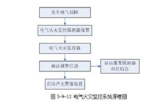 四、系統(tǒng)工作原理發(fā)生電氣故障時(shí),電氣火災(zāi)監(jiān)控探測(cè)器將保護(hù)線路中的剩余電流、溫度等電氣故障參數(shù)信息轉(zhuǎn)變?yōu)殡娦盘?hào),經(jīng)數(shù)據(jù)處理后,探測(cè)器做出報(bào)警判斷,將報(bào)警信息傳輸?shù)诫姎饣馂?zāi)監(jiān)控器。電氣火災(zāi)監(jiān)控器在接收到探測(cè)器的報(bào)警信息后,經(jīng)確認(rèn)判斷,顯示電氣故障報(bào)警探測(cè)器的部位信息,記錄探測(cè)器報(bào)警的時(shí)間,同時(shí)驅(qū)動(dòng)安裝在保護(hù)區(qū)域現(xiàn)場(chǎng)的聲光警報(bào)裝置,發(fā)出聲光警報(bào),警示人員采取相應(yīng)的處置措施,排除電氣故障、消除電氣火災(zāi)隱患,防止電氣火災(zāi)的發(fā)生。電氣火災(zāi)監(jiān)控系統(tǒng)的工作原理如圖3-9-12所示。