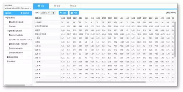 用能報(bào)表統(tǒng)計(jì)變電所各配電回路逐時(shí)、逐日、逐月用能,數(shù)據(jù)以表格形式顯示,并可導(dǎo)出至Excel中;