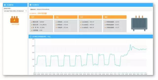 變壓器監(jiān)測(cè)顯示變電所內(nèi)所有變壓器的運(yùn)行狀態(tài)(容量、負(fù)荷率、功率因素、電流、電壓、繞組溫度等),并繪制當(dāng)天的視在功率曲線;