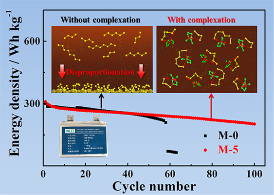 鋰硫電池具有能量密度高、成本低、環(huán)境友好的優(yōu)勢,是國際儲能領域的研究熱點之一。然而,由于鋰硫電池存在多硫化鋰飛梭、多硫化鋰歧化、電解液分解、金屬鋰枝晶粉化等問題,導致其循環(huán)壽命短,尚未滿足大規(guī)模產業(yè)化發(fā)展的要求。該研究團隊針對多硫化鋰歧化的問題,基于“軟硬酸堿理論”,通過在電解液引入大體積陽離子來絡合多硫根離子,有效提高了多硫化鋰在電解液中的穩(wěn)定性。采用該電解液組裝的5000mAh鋰硫電池器件的比能量可達300Wh/kg,且穩(wěn)定循環(huán)100次以上,容量保持率約70%。該工作為提高鋰硫電池的循環(huán)壽命提供了新思路和新策略。