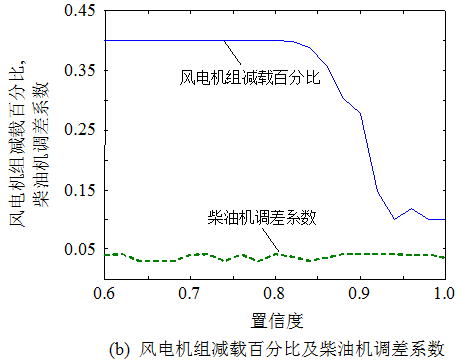 本文基于傳統(tǒng)機(jī)組靜態(tài)頻率特性,研究了微電網(wǎng)孤島運(yùn)行時(shí)柴油機(jī)與風(fēng)儲(chǔ)聯(lián)合調(diào)頻的一次調(diào)頻特性和備用成本,提出了采用機(jī)會(huì)約束規(guī)劃對(duì)微電網(wǎng)一次調(diào)頻備用容量與儲(chǔ)能進(jìn)行優(yōu)化配置的方法。通過機(jī)會(huì)約束規(guī)劃得到了不同置信度下風(fēng)電機(jī)組需配置的儲(chǔ)能功率值,為微電網(wǎng)不同調(diào)差系數(shù)下風(fēng)電機(jī)組、柴油機(jī)一次備用配置提供了優(yōu)化方案。