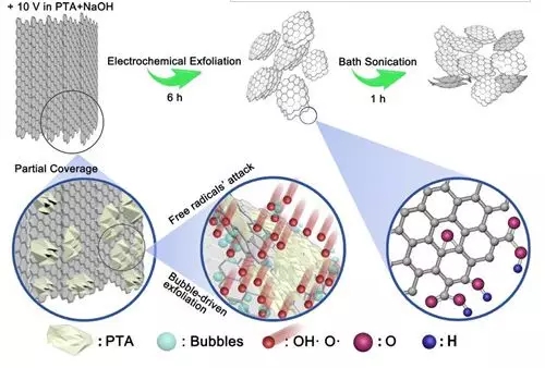 近期,學(xué)術(shù)期刊《Green Chemistry》在線刊發(fā)了中科院上海微系統(tǒng)所石墨烯粉體材料研究團(tuán)隊(duì)丁古巧、何朋等科研人員在水溶性石墨烯材料制備方面取得的重要進(jìn)展:基于創(chuàng)新的電化學(xué)技術(shù)和超聲輔助分散機(jī)制,在NaOH與PTA混合電解液體系中實(shí)現(xiàn)了少層高濃度水溶性石墨烯的制備。在這一體系中,研究人員通過控制電化學(xué)過程,使PTA析出并吸附于石墨電極,促進(jìn)石墨充分氧化和逐層剝離,隨后輔以超聲處理進(jìn)一步提高產(chǎn)率,實(shí)現(xiàn)了高產(chǎn)率(87.3 %)、高固含量(8.2 g/L)以及高穩(wěn)定性(8個(gè)月以上)的少層微米尺寸水溶性石墨烯的制備,相對于已有研究報(bào)道具有明顯優(yōu)勢。