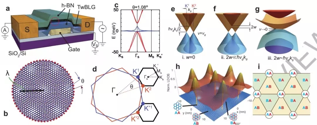 對于結(jié)構(gòu)高度有序的單層石墨烯而言,電學(xué)性能取決于對稱性。研究人員制備了旋轉(zhuǎn)扭曲的雙層石墨烯,通過電子之間的相互作用來控制整個(gè)體系的電子態(tài)。旋轉(zhuǎn)產(chǎn)生的位錯(cuò)使石墨烯層中的電子能帶結(jié)構(gòu)不再對齊,單胞變大。