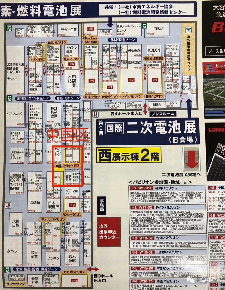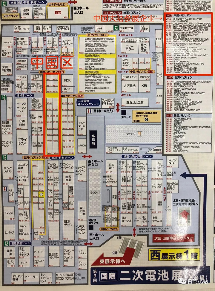 會場1樓主要為鋰電池展,會場2樓主要為燃料電池展。從展區(qū)平面圖上我們可以看出,中國企業(yè)展區(qū)占了很大一部分(這之中不計未出展中國企業(yè),但有參加展會人員)。同時也可以看出,鋰電池展會中并沒有像Panasonic,SONY,GS Yuasa等傳統(tǒng)日本電池企業(yè)的身影,他們干嘛去了?