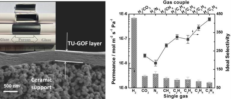 在該研究中,研究員孫予罕、曾高峰團(tuán)隊(duì)選擇了具有雙NH2-和C=S-多活性終端,分子骨架僅有3原子,且具有弱還原性的硫脲(TU)作為交聯(lián)分子。為獲得均質(zhì)連續(xù)的GOF復(fù)合膜,該團(tuán)隊(duì)首先通過(guò)載體表面嫁接的活性基團(tuán)與GO反應(yīng),在載體上固定單層GO;再由TU、GO經(jīng)脫水縮合和親核加成反應(yīng),在載體上實(shí)現(xiàn)周期性組裝形成均質(zhì)TU-GOF復(fù)合膜,首次實(shí)現(xiàn)層層自組裝。通過(guò)條件控制,TU-GOF膜的層間距可精確調(diào)控,膜厚可控制在數(shù)十納米。表征結(jié)果證實(shí),TU對(duì)碳層的固定作用極大抑制了膜在分離介質(zhì)中的溶脹變形,顯著增強(qiáng)了膜的機(jī)械穩(wěn)定性。分離結(jié)果表明,TU-GOF膜對(duì)H2具有高選擇性,如H2/CO2、H2/N2和H2/CH4理想選擇性達(dá)~200,H2滲透速率為10-7mol/m2/s/Pa。這是GO基膜首次基于二維層間篩分實(shí)現(xiàn)H2高效分離,且性能遠(yuǎn)高于聚合物膜的Robeson上限,也優(yōu)于大部分無(wú)機(jī)膜。