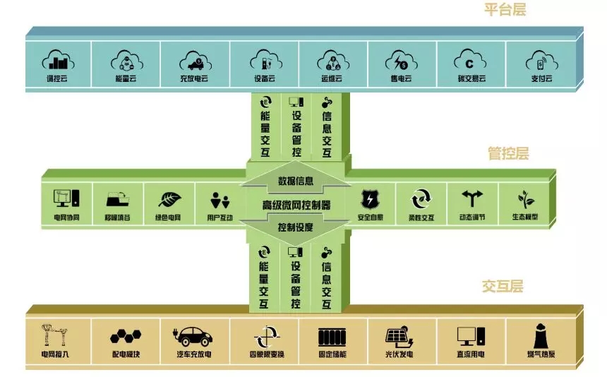 上圖為“王”字微網(wǎng)技術(shù)體系,由下而上分別為:交互層、管控層、平臺(tái)層,可以從這三個(gè)角度去思考能量管理系統(tǒng)。