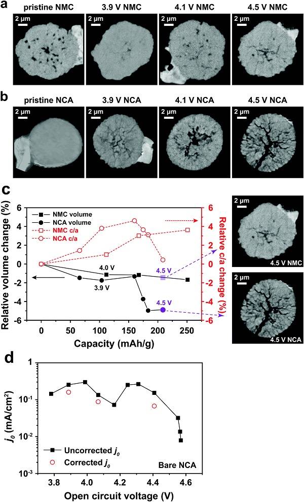 (d)從充電至4.5V(紅色點(diǎn))后的TXM結(jié)果獲得的總表面積進(jìn)行校正,得到NCA顆粒vs. SOC的交流電流密度測量值j0,顯示出斷裂表面積的校正小于j0 在OCV(和SOC)的變化。