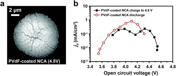(b)PVdF涂覆的NCA在充電時表現(xiàn)的j0與OCV行為,其與裸NCA(圖2d和e)情況類似,但在放電期間極大地改善了j0的滯留。