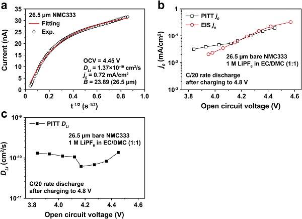 (a)對于直徑為26.5μm的NMC333顆粒,測得的PITT電流與時間的關(guān)系數(shù)據(jù)和對應(yīng)的最小平方擬合,依次獲得動力學(xué)參數(shù)。