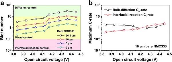 (b)假定典型平均粒徑為10μm,顯示100mV的超電勢可獲得的最大C倍率,速率限制分別假設(shè)是 j0或DLi;在充電電壓<4.2V時,界面電荷轉(zhuǎn)移是限速的,而在更高的充電電壓下,混合控制占據(jù)優(yōu)勢。