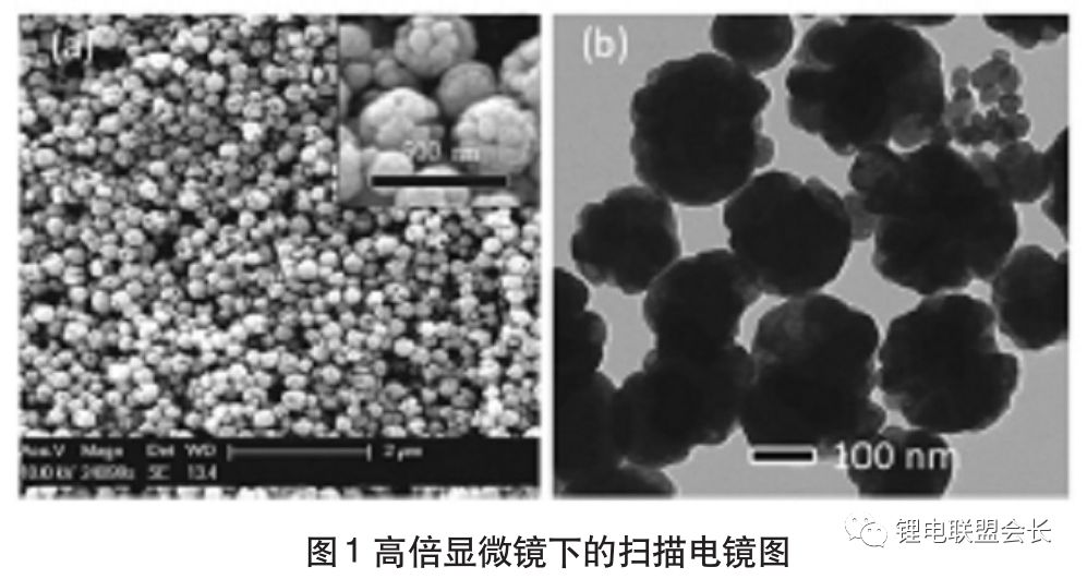 1碳負(fù)極材料:此種類型的材料無論是能量密度、循環(huán)能力,還是成本投入等方面,其都處于表現(xiàn)均衡的負(fù)極材料,同時(shí)也是促進(jìn)鋰離子電池誕生的主要材料,碳材料可以被劃分為兩大類別,即石墨化碳材料以及硬碳。其中,前者主要包括人造石墨以及天然石墨。人造石墨的形成過程為:在2500℃以上的溫度中,將軟碳材料進(jìn)行石墨化處理之后得到,MCMB屬于人造石墨中比較常用的一種,其結(jié)構(gòu)為球形,表面質(zhì)地較為光滑,直徑大約為5-40μm。由于受其表面光滑程度影響,使電極表面以及電解液之間發(fā)生反應(yīng)的幾率降低,進(jìn)而降低了不可逆容量。同時(shí),球形結(jié)構(gòu)能夠方便鋰離子在任何方向進(jìn)行嵌入和脫出活動,對保障結(jié)構(gòu)穩(wěn)定具有較大的促進(jìn)作用。天然石墨也具有諸多優(yōu)勢,其結(jié)晶度較高、可嵌入的位置較多,并且價(jià)格較低,是較為理想的鋰離子電池材料。但其也存在一定的弊端,例如在與電解液反應(yīng)時(shí),相容性較差,在進(jìn)行粉碎時(shí)表面存在諸多缺陷等,這都將對其充電或放電的性能產(chǎn)生較大的不利影響。此外,硬碳的形成過程為:在2500℃的狀態(tài)下,難以實(shí)施石墨化的碳材料,其主要為高分子化合物的熱解碳,通過高倍顯微鏡能夠看出,其是由許多納米小球堆積而成,整體呈現(xiàn)出花團(tuán)簇狀,具體如圖1所示。在其表面具有大量納米孔的無定形區(qū)域,在容量方面遠(yuǎn)遠(yuǎn)超過石墨的標(biāo)準(zhǔn)容量,進(jìn)而對循環(huán)能力產(chǎn)生較大的不利影響。