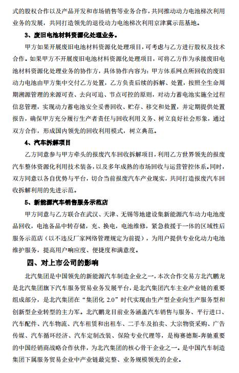 公司和北汽集團(tuán)在退役動力電池梯次利用和廢舊電池資源化處理體系、報(bào)廢汽車回收拆解體系及新能源汽車后服務(wù)等業(yè)務(wù)上開展強(qiáng)強(qiáng)合作,將有效解決新能源汽車與動力電池報(bào)廢后的回收利用難題,促進(jìn)新能源汽車走向從綠色消費(fèi)到綠色回收的“綠色到綠色”閉路循環(huán),是落實(shí)國家綠色發(fā)展的具體實(shí)踐,是落實(shí)國家對汽車和動力電池回收利用要求的良好體現(xiàn),本次合作將打通公司與世界大型新能源汽車產(chǎn)業(yè)集團(tuán)合作回收動力電池的通道,可以有效促進(jìn)公司“動力電池回收—原料再造—材料再造---動力電池包再造---新能源汽車服務(wù)”新能源全生命周期價(jià)值鏈的有效實(shí)施,促進(jìn)公司實(shí)現(xiàn)經(jīng)濟(jì)效益、環(huán)境效益與社會效益的有機(jī)統(tǒng)一,樹立報(bào)廢新能源汽車、動力電池回收利用與循環(huán)經(jīng)濟(jì)模式典范,對公司建設(shè)全球領(lǐng)先的動力電池回收利用模式與回收產(chǎn)能意義重大。