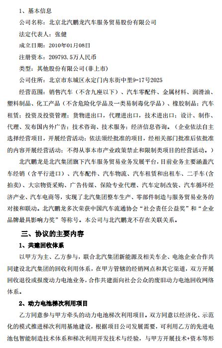 北汽集團(tuán)是中國領(lǐng)先的新能源汽車制造企業(yè)之一,本次合作交易方北汽鵬龍是北汽集團(tuán)旗下汽車服務(wù)貿(mào)易業(yè)務(wù)發(fā)展平臺,是北汽集團(tuán)汽車主業(yè)產(chǎn)業(yè)鏈的重要組成部分,是北汽集團(tuán)在“集團(tuán)化2.0”時代實(shí)現(xiàn)由生產(chǎn)型企業(yè)向生產(chǎn)服務(wù)型和創(chuàng)新型企業(yè)轉(zhuǎn)型的主力軍。北汽鵬龍目前業(yè)務(wù)涵蓋汽車銷售與服務(wù)、平行進(jìn)口、汽車配件、汽車物流、汽車租賃和出租車、二手車及拍賣、大宗物資采購、廣告?zhèn)髅?、汽車循環(huán)經(jīng)濟(jì)、汽車定制改裝、保險(xiǎn)專業(yè)代理等,是梅賽德斯-奔馳重要的中國經(jīng)銷商戰(zhàn)略合作伙伴,為北汽集團(tuán)的核心骨干企業(yè)之一。是中國汽車制造集團(tuán)下屬服務(wù)貿(mào)易企業(yè)中產(chǎn)業(yè)鏈最完整、業(yè)務(wù)規(guī)模領(lǐng)先的企業(yè)。