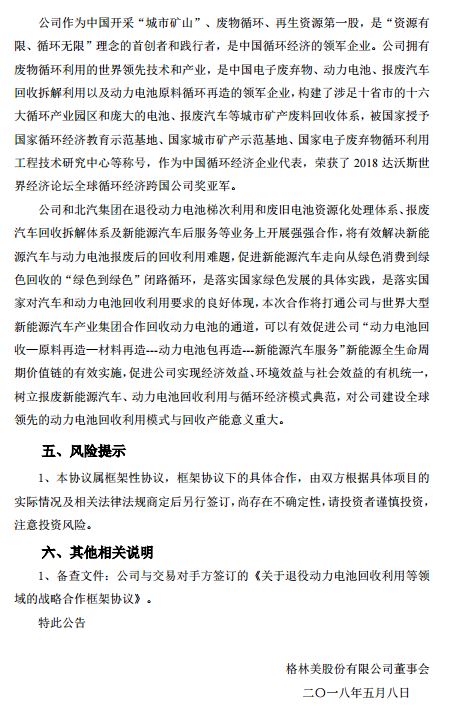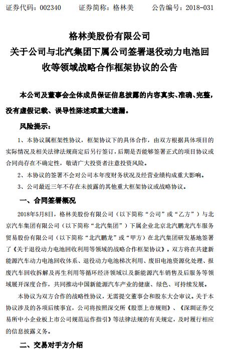 2018年5月8日,格林美股份有限公司(以下簡稱“公司”或“乙方”)與北京汽車集團(tuán)有限公司(以下簡稱“北汽集團(tuán)”)下屬企業(yè)北京北汽鵬龍汽車服務(wù)貿(mào)易股份有限公司(以下簡稱“北汽鵬龍”或甲方)在北汽集團(tuán)研發(fā)基地簽署了《關(guān)于退役動力電池回收利用等領(lǐng)域的戰(zhàn)略合作框架協(xié)議》。雙方將在共建新能源汽車動力電池回收體系、退役動力電池梯次利用、廢舊電池資源化處理、報(bào)廢汽車回收拆解及再生利用等循環(huán)經(jīng)濟(jì)領(lǐng)域以及新能源汽車銷售及后服務(wù)等領(lǐng)域展開深度合作,共同推動中國新能源汽車產(chǎn)業(yè)的健康、綠色、可持續(xù)發(fā)展。