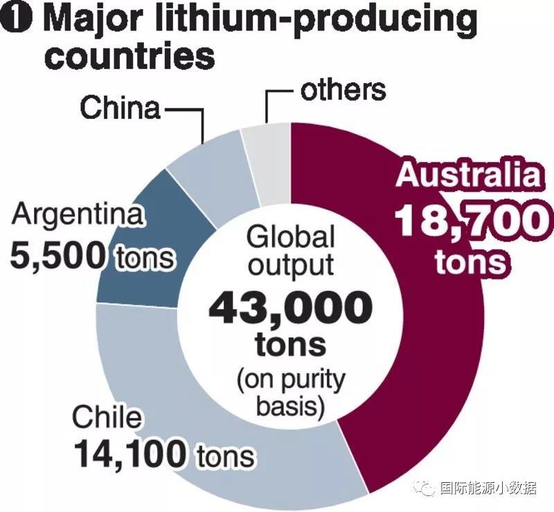 2017年全球金屬鋰產(chǎn)量4.3萬噸,其中澳大利亞1.87萬噸,智利1.41萬噸,阿根廷5500噸。